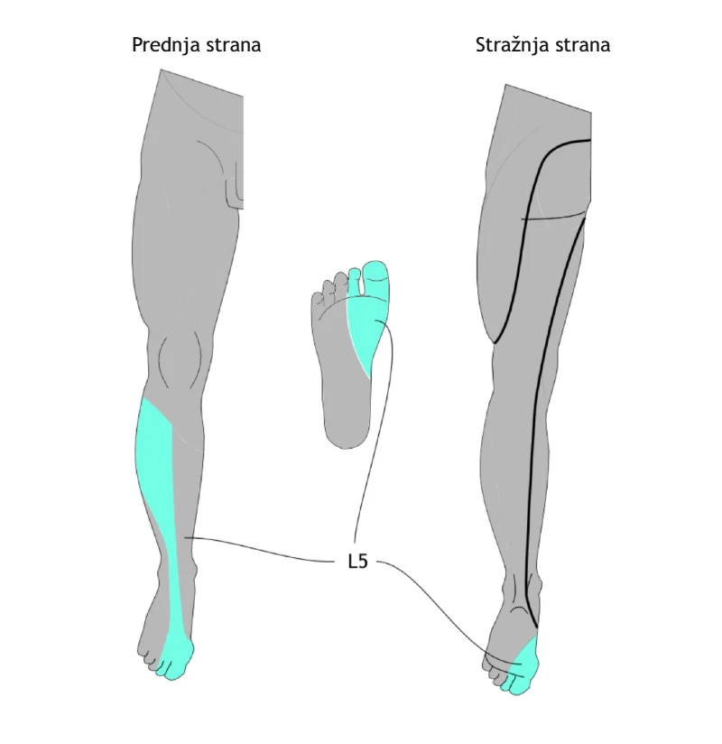 Na slikama ispod prikazano je područje potkoljenice i stopala u kojem se osjećaju trnci u nogama kod oštećenja ili iritacije lumbalnog korijena L5 odnosno S1: